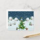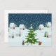 Peaceful snowy night in Christmas village with beautiful Christmas tree in the middle of small houses with pine trees, birds, bunny and squirrel.