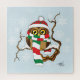 Cute chubby round owl all in red and green. Snowflakes falling all around him