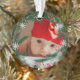 Acrylic so very light weight. Baby Ornament with PHOTO of the BABY, some faint WHITE snow flakes randomly located and a little cute whimsical Christmas Snow Man / Snowman on a pile of SNOW.