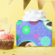 Snowflake wrappping paper with space for fourteen favourite family photos. Purple background.