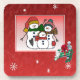 A cute picture tube snowman family wearing beanies and scarves. They have a carrot noses and sticks for arms. A green letter box with mail and a red ribbon is in the foreground. The background is red with snowflakes scattered randomly.