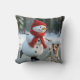 A cheerful snowman in a red knitted hat and scarf joyfully skates on a frozen pond, while a playful terrier dog joins the fun against a snowy forest backdrop