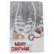 Snowman with holiday wreath for deer in winter woods with Christmas decorations and snowflakes.