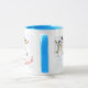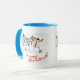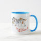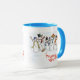 A white ringer mug with a powder blue rim and handle and five jolly snowmen on the front and back, from a handpainted watercolour design by Judy Adamson. This design is also available as a Christmas card.