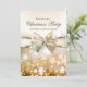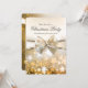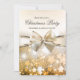 Elegant ivory satin background design with profusion of gold stars and sparkle bling effect in gold and ivory tones on lower card area. Pretty bow in ivory and gold adds finishing touch on this lovely Christmas party invitation template. Matching card back design. All text on front and back is ready for you to customise with your party invitation information..