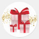 This small size round sticker is shown with a festive Christmas holiday packages print.