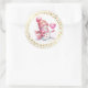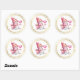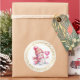 Christmas sticker is shown in a round shape with a cute festive pink snowman art print.