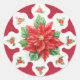 Round Christmas stickers with a red poinsettia with green leaves on a white snowflake background. Little red flowers decorate each point which has a red background.