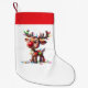 This holiday Christmas stocking is shown in a cute Rudolph in lights print.
