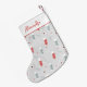 This cute Christmas stocking features a pattern of red and grey Christmas stockings, pine tree sprigs and snowflakes, on a light grey background. Click "Personalise this Template" to easily change the featured sample name.