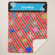 Festive red, green and white Christmas candy colors. geometric stripes. Name in cool snowcapped white typography against sky blue banner. Snowflakes elements. Blue, pink and gold hand-painted ornament balls. Original Artwork Design by TamiraZDesigns.