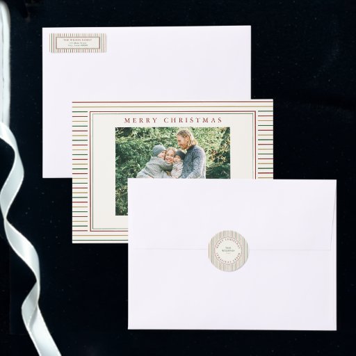 Create your own custom photo Christmas cards with gold foil. Features one of your favourite family pictures alongside personalised minimalist typography names and year on a simple stripes background in red green and gold holiday colours. Add your own heartfelt message to friends and family on the back of this card.