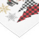 Add charm to your holiday decor with this personalised Christmas table runner, featuring buffalo plaid trees in red/black and grey/black, and a delightful snowman in the centre with the festive greeting "Merry Christmas." A plaid-scarfed snowman, along with vibrant snowflakes in blue, silver, and gold, creates a warm holiday scene. Personalise it with your family name inside a beautiful green and red holly flourish for a unique touch. This runner is perfect for adding a personalised festive accent to family gatherings and Christmas dinners.