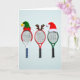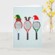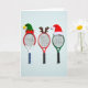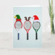 This image blends sports and holiday cheer in a fun way. Three small tennis rackets are arranged neatly on a soft mint-green background. Each racket wears a different holiday hat, giving the scene a playful and festive look. The red and white racket has a green elf hat with a yellow pom-pom. The bright red racket has brown reindeer antlers, adding a hint of mischief. The green racket wears a classic Santa hat with white trim. The simple layout and soft lighting make the image feel clean, cheerful, and full of holiday spirit.