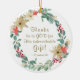 Inspirational personalised Christmas ornament depicts a simple watercolor floral wreath with elegant white and pink Poinsettias, Eucalyptus greenery, and red berries. It features Bible Verse 2 Corinthians 9:15, "Thanks be to God for His indescribable gift!" _