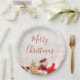 Paper plates with a rustic photograph. A light brown wooden board with various Christmas elements along the bottom. Christmas gifts, a gold Christmas tree, baubles and some holiday fruits.