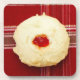 Beautiful photograph featuring jelly-filled thumb cookies with a red and green plaid background.