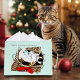 A chubby calico cat is in an opened Christmas box of toys and is happier with the box the toys came in.