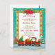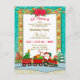 The design features a playful Christmas train carrying Santa Claus, gifts, and a decorated tree through a snowy, festive landscape. Bright string lights, poinsettias, and a charming snowflake background frame the party details, setting a wonderfully cheerful tone.