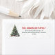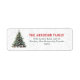 A decorated Christmas tree with snow and falling snowflakes. Personalise with your name and address. Traditional colours; Red and green.