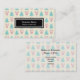 Business card with a cute christmas pattern with a cream coloured background with illustrations of a pastel greenish blue coloured christmas tree and a pastel pink bauble with a ribbon in a repeating pattern. The centre has a black rectangle with a white frame where you enter your business details. Nice contrast with the cream coloured pastel pattern.
