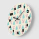 Clock with a cute christmas pattern with a cream colored background with illustrations of a pastel greenish blue colored christmas tree and a pastel pink bauble with a ribbon in a repeating pattern.