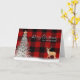 White Christmas pine tree with gold bells, deer and a bird wearing winter scarf on red and black lumberjack plaid for Merry Christmas and happy new year.