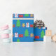 A wrapping paper designed with Christmas trees and gifts on a blue background. Merry Christmas!