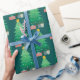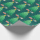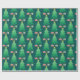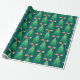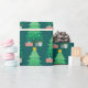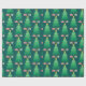 This Christmas gift wrapping paper features a whimsical and festive graphic of a decorated Christmas tree accented with gifts. The background is dark teal.
