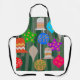 This apron has a design that looks like ornaments in red, green, blue, pink, gold, silver, and white on a Christmas tree.