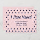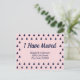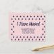 You can personalise dark blue text with your name and new address. At the top, you can customise the dark blue script that says "I Have Moved". This pale pink holiday moving announcement has a pattern of dark blue Christmas trees on the front. The back is pale pink.