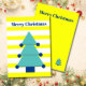 Change up your Christmas wishes with this modern striped Christmas design. Still using the traditional seasonal colours this design uses yellow and blue. The blue tree has decorations hanging of it.