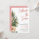 Simple Christmas party invitation featuring a Christmas tree, some candles, ribbon and red modern calligraphy text. Great for a workplace party or to invite friends to celebrate Christmas with you.