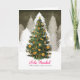 This Christmas and New Year's foreign language card is in Spanish. A Christmas tree is decorated with golden baubles and stands in the snow. More fir trees are in the back with snow falling all around. English translation: "Merry Christmas and a Prosperous (Happy) New Year". Inside: "¡Les deseo paz y alegría!". English: "I (we) wish you peace and joy!"