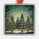 Christmas Tree Forest Celebration. Decorated Christmas trees with musical notes and gold stars. Festive holiday design.