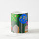 This mug has a design that looks like ornaments in red, green, blue, pink, gold, silver, and white on a Christmas tree.
