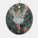 This lovely fairy angel ornament captures the beautiful festive elegance of Christmas. This painting of an angel on this gorgeous ornament is shown in all of her heavenly splendour. Her cute white dress and ethereal wings are painted in creamy pastels that harmoniously mix into a background of Christmas greenery. This ornament's artwork creates a stunning holiday vibe.