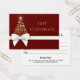 Luxurious and rich holiday design featuring a splendid Christmas tree silhouette with golden snowflakes. Decorated with a white gold gift bow on a red lush background. This festive gift certificate is perfect for your small business or to gift friends and family.