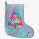 Colourful and cute modern Christmas design of modern watercolor christmas tree painted by artist Sacha Grossel. This funky blue and pink coloured tree on faux pink glitter background is arty and fun for a modern Christmas theme. Name gift can be personalised.