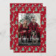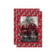 Personalized Holiday Photo Card Whimsical Watercolor Christmas Tree, Wine & Cheese on a festive red background.