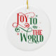 This Christmas tree ceramic ornament is shown in a round shape with a festive holiday Joy to the world print.