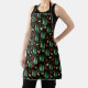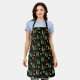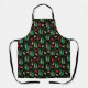 This holiday apron features a retro holiday pattern of Christmas trees, gifts and gold swirls in muted greens, dark red and gold on a black background.