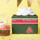 A trendy, fun, cool and geometric triangle christmas tree in bright red filled with baubels and confetti set against a forest green background. The words Merry Christmas appear below in a flowing, elegant font. Ideal for decorating your gifts and presents this festive season.