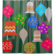 This shower curtain has a design that looks like ornaments in red, green, blue, pink, gold, silver, and white on a Christmas tree.