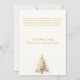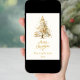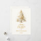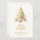 A soft beige background. Decorated with a Christmas tree covered in snow. Your text and names on the back. Merry Christmas is written with an elegant hand-lettered style font.