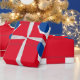 Change up your Christmas wishes with this modern Christmas design. Still using the traditional seasonal colours this design uses red white and blue. The red tree has decorations hanging of it.