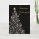 A Christmas tree at night lit with hundreds of lights and topped with a shinning star. The words Seasons Greetings done in sparkling gold.