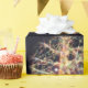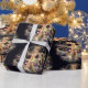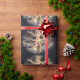 A leafless tree with a sprinkling of snow is sparkling with many-coloured lights against a dark winter sky. Some little creature has made its home in the tree trunk - there's a tiny red door with a Christmas wreath on it, and on along the trunk are little round windows glowing with the warm firelight and candlelight from inside.