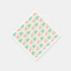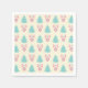 Paper napkins with a festive christmas pattern on a cream coloured background. Illustrations of pastel coloured, greenish-blue, christmas trees and pastel pink baubles and bows in a repeating pattern.