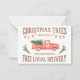 Our favourite "Christmas Tree" advertising sign that we've designed yet. It contains two great complimentary fonts, watercolor clip art elements, the iconic vintage red pick-up truck, old style, big bulb tree lights and some branches to frame the bottom. It reads: "Christmas Trees, Fresh Cut Daily, Family Owned Since 1972, Free Local Delivery". By Monkey Business Graphic Design, July 2020.